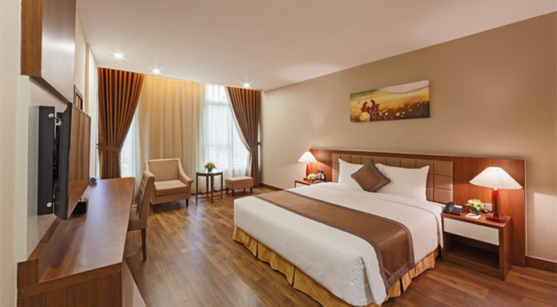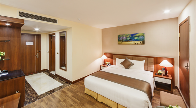 - Phòng ngủ hạng Deluxe hướng thành phố với nội thất sang trọng mà không kém phần ấm cúng trang nhã.