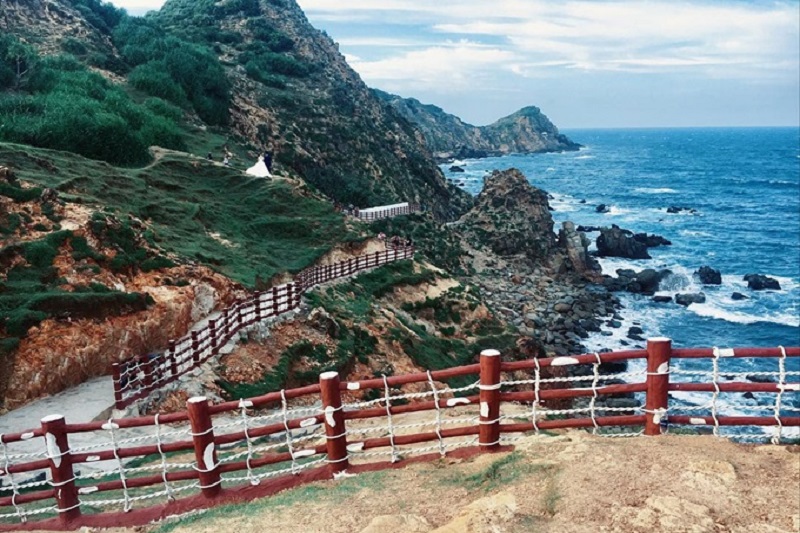 Eo Gió cách trung tâm thành phố Quy Nhơn 20 km về phía đông bắc, thắng cảnh nổi tiếng với vẻ đẹp hoang sơ. Đến đây bạn sẽ có những góc chụp hình và ngắm cảnh tuyệt đẹp. Nằm trên địa bàn xã Nhơn Lý, Eo Gió là một địa danh du lịch mới mà du khách khi đến du lịch Quy Nhơn này đều muốn ghé tham quan. Đặc biệt, Eo Gió mới xuất hiện cung đường đi bộ tuyệt đẹp trên lưng chừng dãy núi, với hàng ngàn bậc thang được dựng với tay vịn an toàn, đẹp mắt và nổi bật với màu đỏ gạch, trắng.